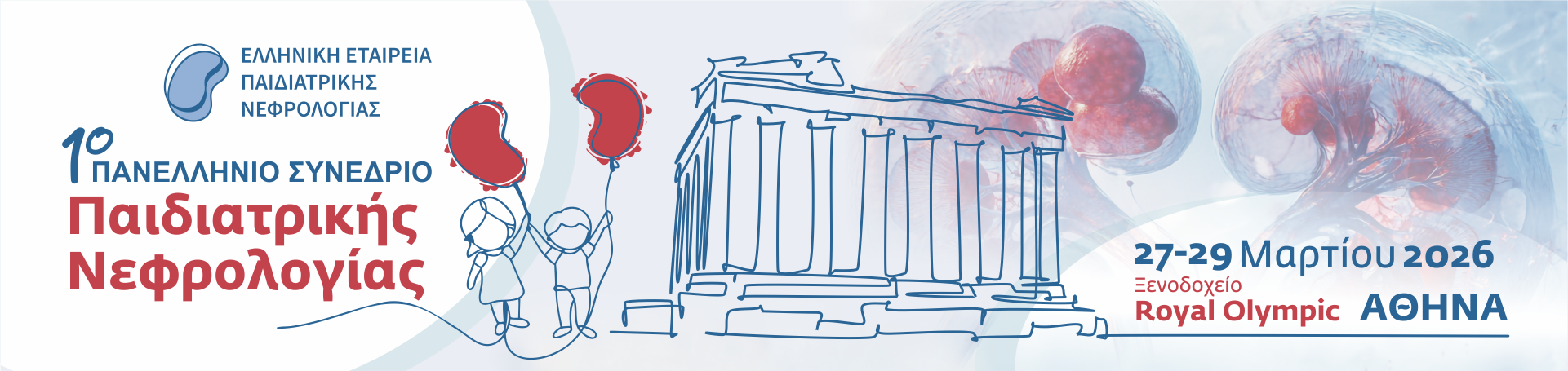 Με ιδιαίτερη χαρά και τιμή σας προσκαλούμε να συμμετάσχετε στο 1ο Πανελλήνιο Συνέδριο Παιδιατρικής Νεφρολογίας, που θα πραγματοποιηθεί στις 27, 28 & 29