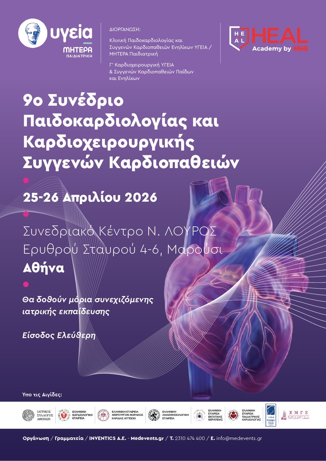 Το 9ο Συνέδριο Παιδοκαρδιολογίας και Καρδιοχειρουργικής Συγγενών Καρδιοπαθειών επιστρέφει στο Συνεδριακό Κέντρο «Ν. Λούρος», Αθήνα, από την Κλινική Παιδοκαρδιολογίας και Συγγενών Καρδιοπαθειών Ενηλίκων και την Γ’ Καρδιοχειρουργική ΥΓΕΙΑ & Συγγενών Καρδιοπαθειών Παίδων & Ενηλίκων.